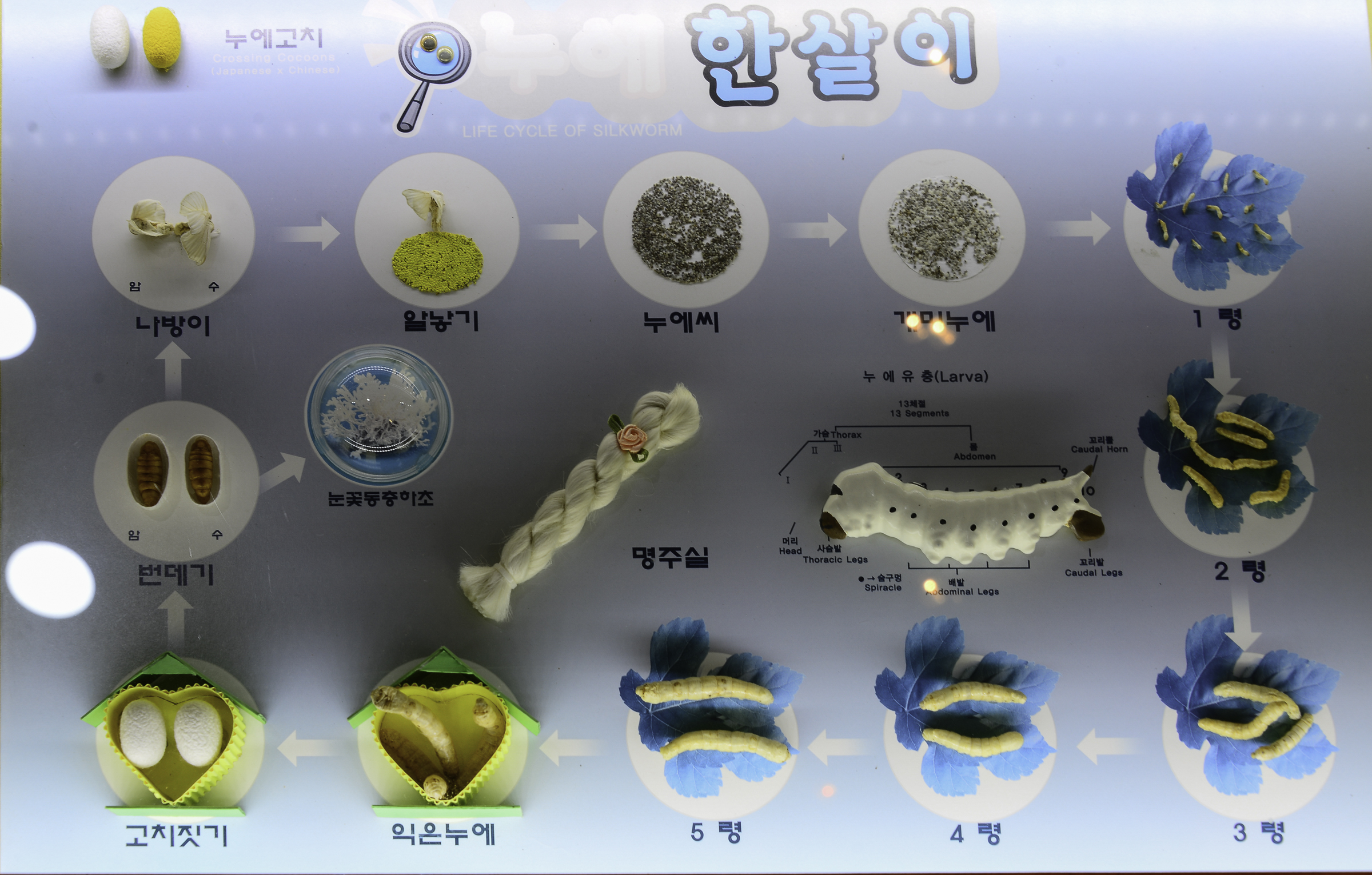 나방이 → 알낳기 → 누에씨 → 개미누에 → 1령 → 2령 → 3령 → 4령 → 5령 → 익은 누에 →고치짓기 →번데기 → 나방이