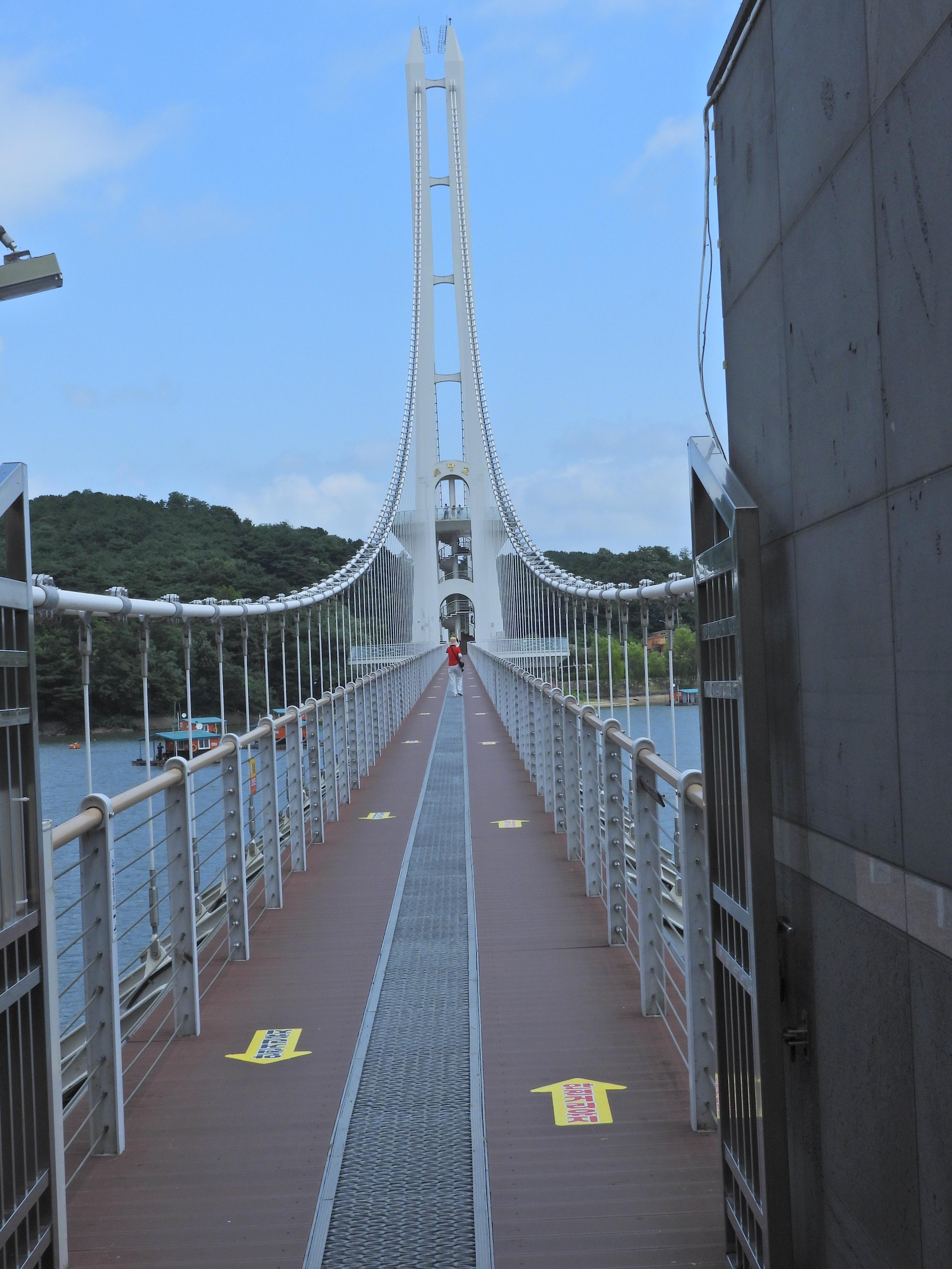 하늘로 곧게 솟은 64m 주탑을 중심으로 양 옆으로 펼쳐진 케이블은 아름다운 자태의 거대한 황새가 길고 흰 날개를 펼쳐 호수 위를 비상하듯 환상 적인 풍경을 자아냅니다. 출렁다리에서 광활한 예당호의 절경을 감상 하노라면, 가슴이 탁 트이는 시원함이 무한한 힐링의 감동을 선사합니다