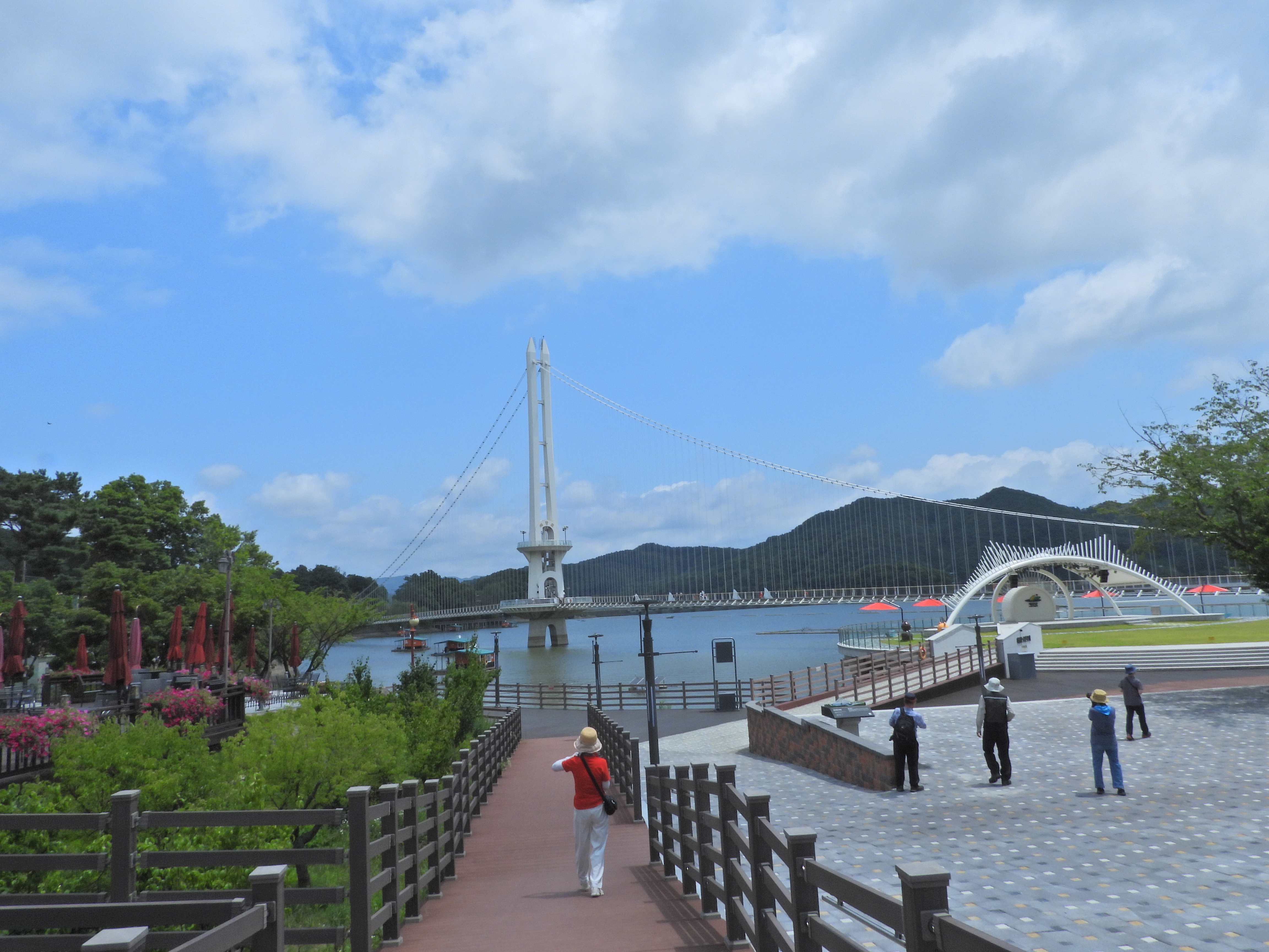 예산을 상징하는 황새와 '예당호 출렁다리'라 쓰여진 곳에는 사진을 찍으려는 사람들의 인기가 많았다. 출렁다리 앞 예당호 문화광장의 인공 폭포 앞에서 시원함을 달래준다.