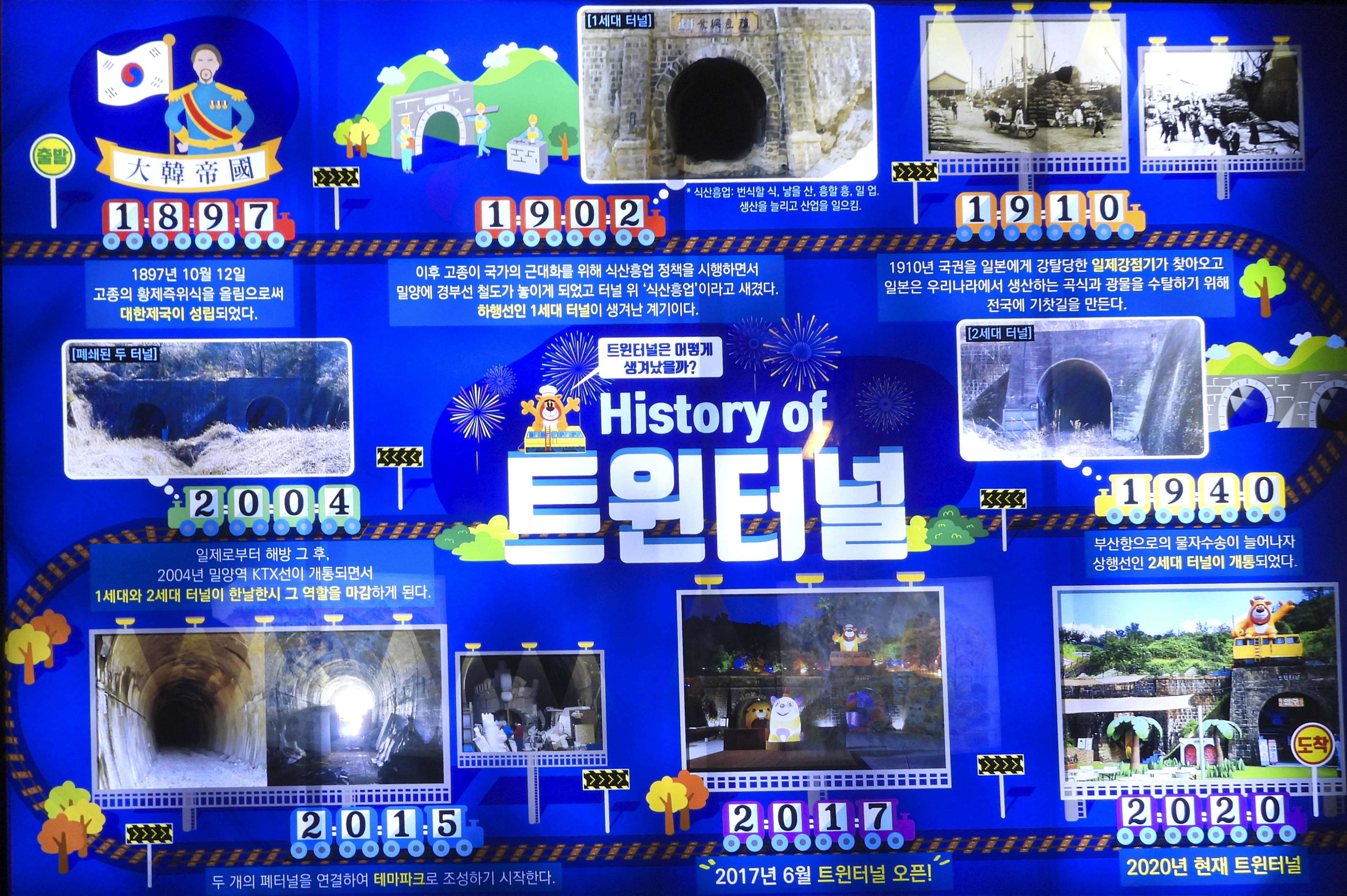 조선시대 고종이 1897년 대한제국을 공포한 이후, 서구 자본주의 도입을 위해 생산을 늘리고 산업을 일으킨다는 뜻의 '식산흥업' 정책을 시행했다. 이에 따라 1902년 밀양에 경부선 철도가 놓여졌고, 1940년 부산항으로 물자수송이 늘자 또 하나의 터널이 개통되었다. 이를 달이 없는 곳이라는 지명에 따라 '무월산 터널'이라 부르게 되었다. 2004년 KTX 가 개통되면서 두 터널은 한낮 한시에 역할을 마감하였고 2017년 두 개의 터널을 하나로 연결하여 많은 사람들에게 사랑받는 테마파크로 재탄생되었다.