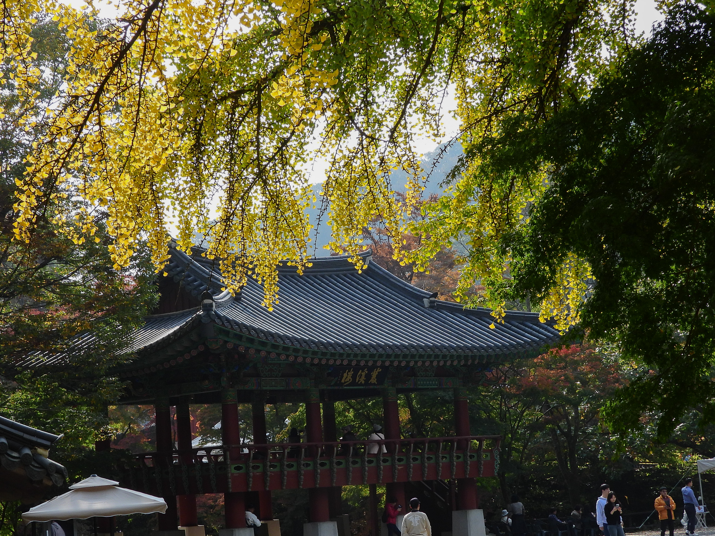 백양사 주변의 단풍나무는 노란빛 은행나무와 초록빛 비자 나무, 감나무가 어울려 가을 정취를 더해줍니다.