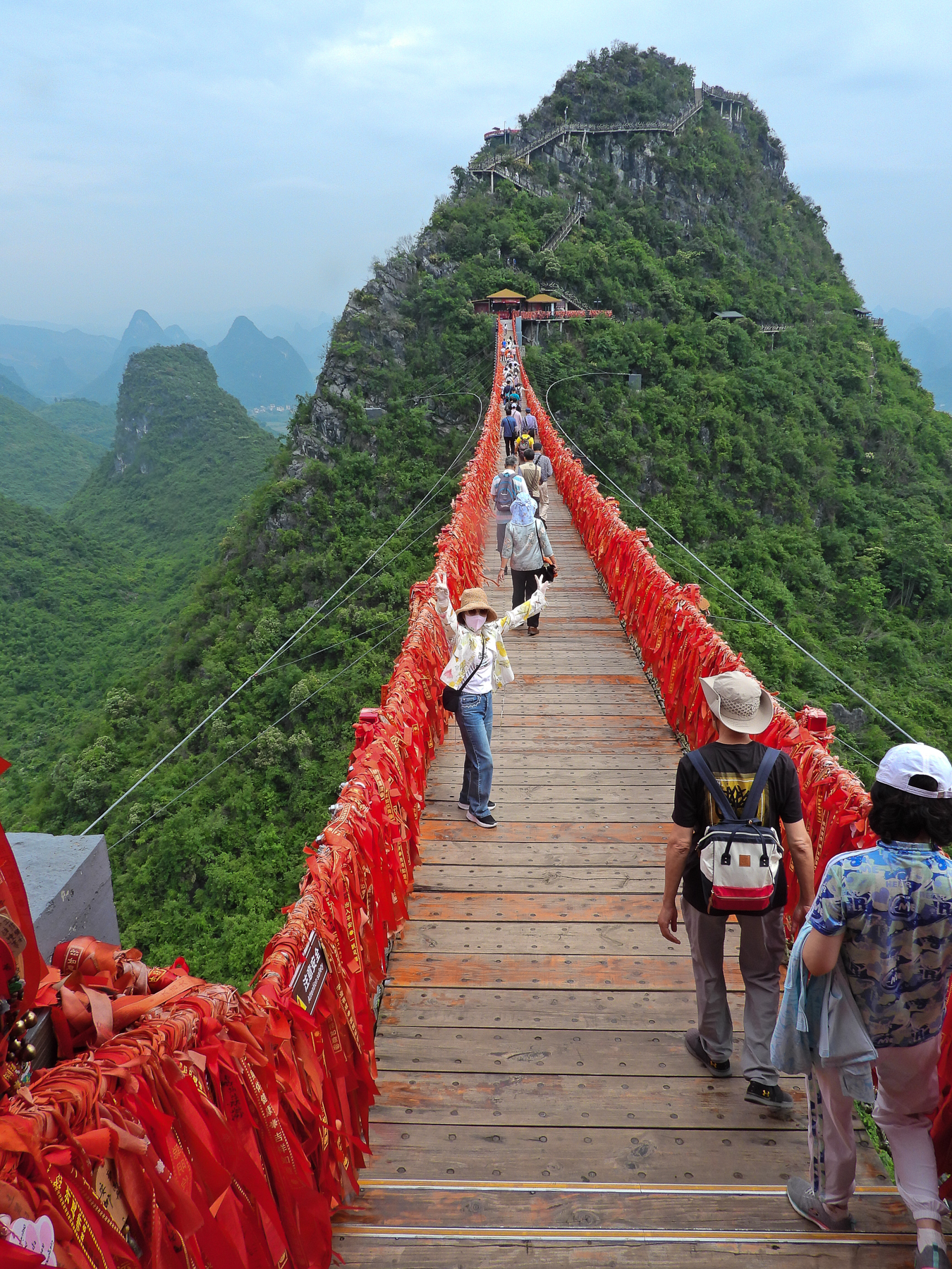 현수교는 피크 루이 정상으로의 주요 접근로로 로프웨이의 반환역과 피크 루이 정상을 연결하며 총 길이는 150m, 폭 2m, 최대 고도는 58m이다. 길이 150m, 각 케이블 무게 2.5t의 8개의 강철 케이블로 구성되며, 다리 데크는 4cm 이상의 두께 부식 방지 목재로 표면화되며, 각 평방미터는 900kg의 압력을 견딜 수 있고 안전하며 견고하다. 멀리서 보면, 현수교는 공중에 떠 있는 명당 결합파처럼 보여서 모두에게 최고의 소원을 가져다줄 것을 암시합니다. 다리 위에서는 양슈오의 카르스트 풍경을 한눈에 볼 수 있습니다. 그리고 한편, 투어 경험을 매우 강화하세요.